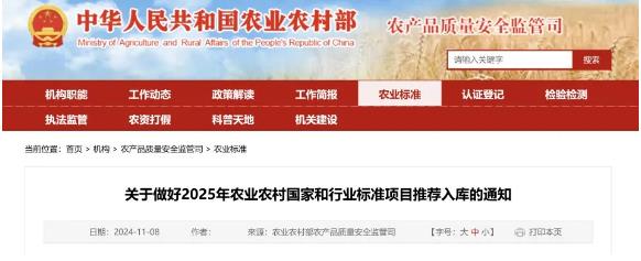 各有關(guān)司局、農(nóng)業(yè)農(nóng)村標準化技術(shù)委員會及技術(shù)歸口單位,各有關(guān)單位:根據(jù)《農(nóng)業(yè)農(nóng)村標準項目庫管理規(guī)定(試行)》,為做好2025年農(nóng)業(yè)農(nóng)村國家和行業(yè)標準項目推薦入庫......