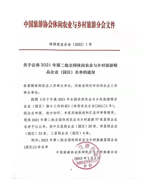 近日,中國(guó)旅游協(xié)會(huì)休閑農(nóng)業(yè)與鄉(xiāng)村旅游分會(huì)下發(fā)通知,公布2021年第二批全國(guó)休閑農(nóng)業(yè)與鄉(xiāng)村旅游星級(jí)企業(yè)(園區(qū))名單,江蘇富金農(nóng)業(yè)科技發(fā)展有限公司(水漾年華)榜上有......