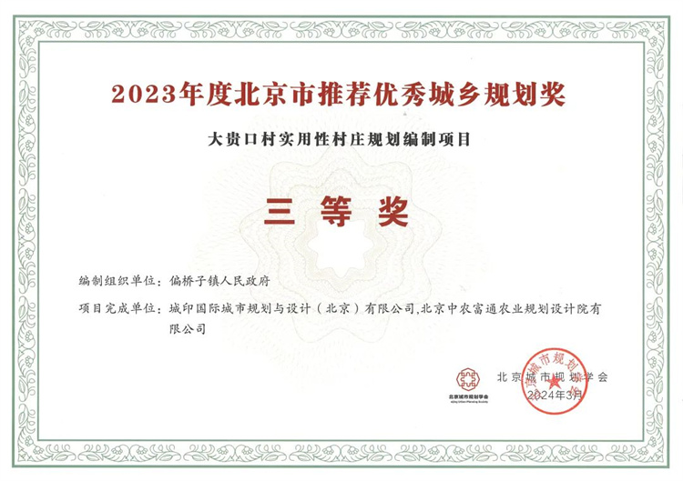近日,由北京中農(nóng)富通農(nóng)業(yè)規(guī)劃設(shè)計院有限公司與城印國際城市規(guī)劃與設(shè)計(北京)有限公司聯(lián)合編制的大貴口村實用性村莊規(guī)劃編制項目,榮獲了2023年度北京市推薦優(yōu)秀城鄉(xiāng)......