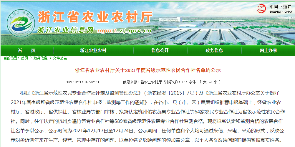 根據(jù)《浙江省示范性農(nóng)民專業(yè)合作社評定及監(jiān)測管理辦法》(浙農(nóng)經(jīng)發(fā)〔2015〕7號)及《浙江省農(nóng)業(yè)農(nóng)村廳辦公室關(guān)于做好2021年國家級和省級示范性農(nóng)民合作社申報(bào)與監(jiān)......