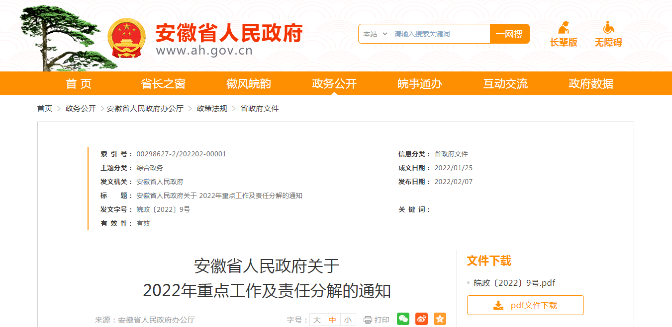 各市、縣人民政府,省政府各部門、各直屬機(jī)構(gòu):2022年是黨的二十大召開之年,是全面落實(shí)省第十一次黨代會精神、加快建設(shè)現(xiàn)代化美好安徽的重要一年。為貫徹落實(shí)中央決策......