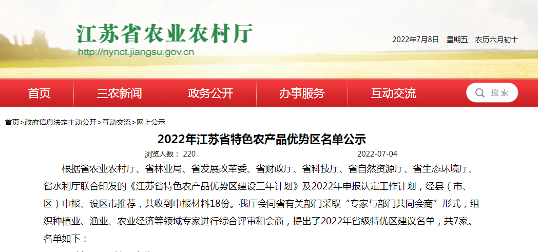 根據(jù)省農(nóng)業(yè)農(nóng)村廳、省林業(yè)局、省發(fā)展改革委、省財(cái)政廳、省科技廳、省自然資源廳、省生態(tài)環(huán)境廳、省水利廳聯(lián)合印發(fā)的《江蘇省特色農(nóng)產(chǎn)品優(yōu)勢區(qū)建設(shè)三年計(jì)劃》及2022年申......