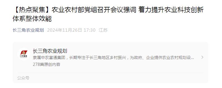 11月25日,農(nóng)業(yè)農(nóng)村部黨組書記、部長韓俊主持召開部黨組會議,審議并原則通過《關(guān)于加快提升農(nóng)業(yè)科技創(chuàng)新體系整體效能的實施意見》。會議強(qiáng)調(diào),要深入學(xué)習(xí)貫徹習(xí)近平總......