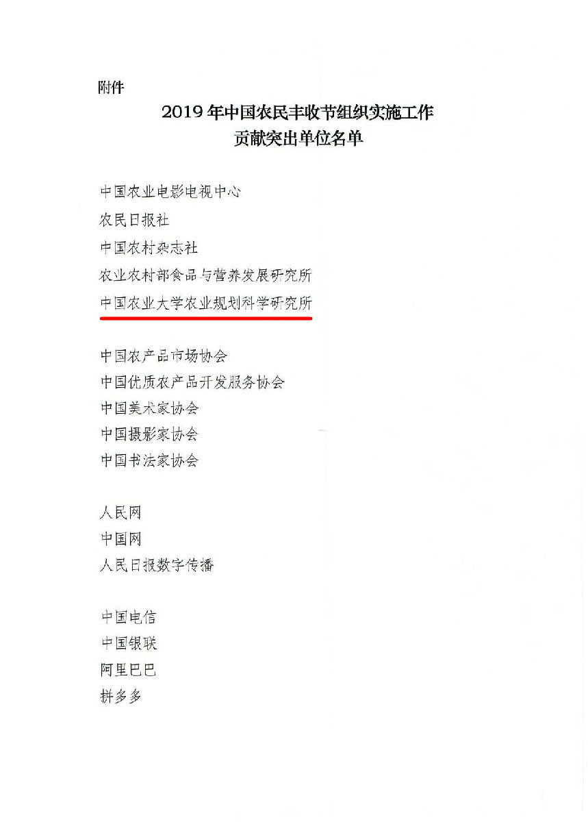 圖:由農(nóng)業(yè)農(nóng)村部牽頭組織成立的中國(guó)農(nóng)民豐收節(jié)組織指導(dǎo)委員會(huì),對(duì)中國(guó)農(nóng)業(yè)大學(xué)農(nóng)業(yè)規(guī)劃科學(xué)研究所、中國(guó)銀聯(lián)等2019年豐收節(jié)期間貢獻(xiàn)突出單位予以表彰