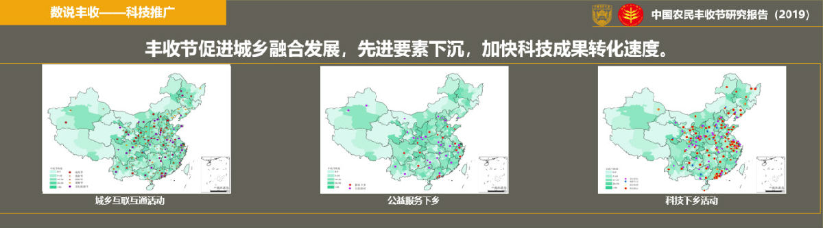 報告》指出各地舉辦中國農(nóng)民豐收節(jié),活動形式和展示對象多種多樣,融合了傳統(tǒng)文化傳承、農(nóng)事體驗、農(nóng)產(chǎn)品展示、農(nóng)業(yè)旅游等元素,在此基礎(chǔ)上,各地還組織了會議論壇、科技宣傳、推介簽約等新的活動,通過與新媒體平臺跨界合作,強化地方農(nóng)產(chǎn)品品牌,促進農(nóng)產(chǎn)品產(chǎn)銷對接;促使先進要素下沉,加快了科技成果轉(zhuǎn)化速度,整體推動城鄉(xiāng)融合發(fā)展。