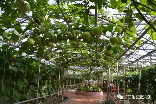 利用果實形態(tài)各異的觀賞瓜果類蔬菜構建園區(qū),特別是利用各式各樣的棚架或長廊栽植藤本瓜果,讓其自然攀爬,形成瓜果滿廊的獨特景觀,既可以供人們休憩,也可以進行觀賞,是農(nóng)業(yè)觀光園中不可缺少的景觀之一,如觀賞葫蘆走廊、觀賞南瓜走廊、櫻桃番茄走廊、蛇瓜林等景觀。