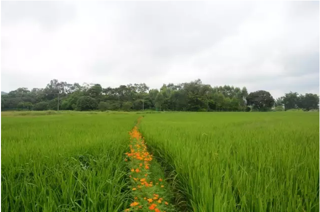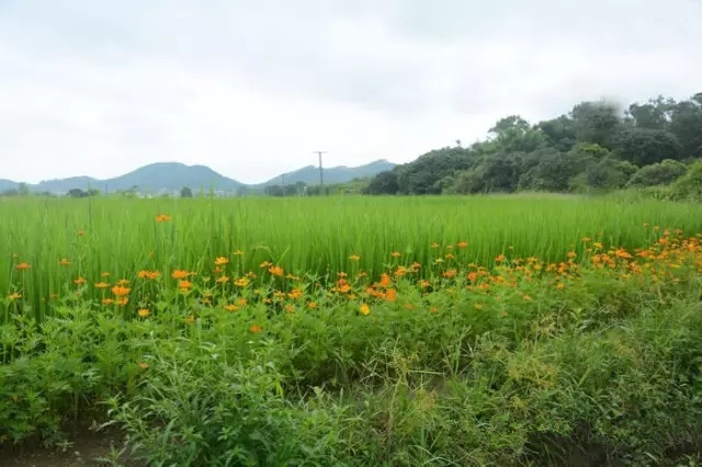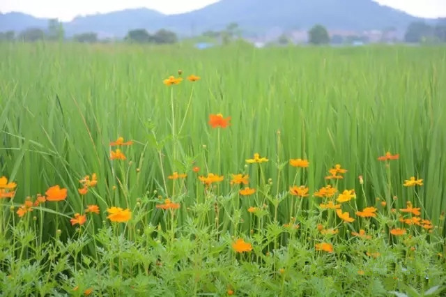 驚呆了,絕對驚呆了!百畝稻田與眾不同,田埂全用泥壘成,且長滿雜草;而田邊竟開滿了鮮花,甚是漂亮,卻不知道花為何名……興奮之余沖進去看個究竟……