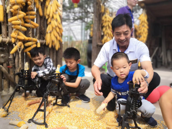 場(chǎng)館內(nèi)的剝玉米、割水稻等農(nóng)事活動(dòng)也引來(lái)孩子和大人爭(zhēng)相體驗(yàn):
