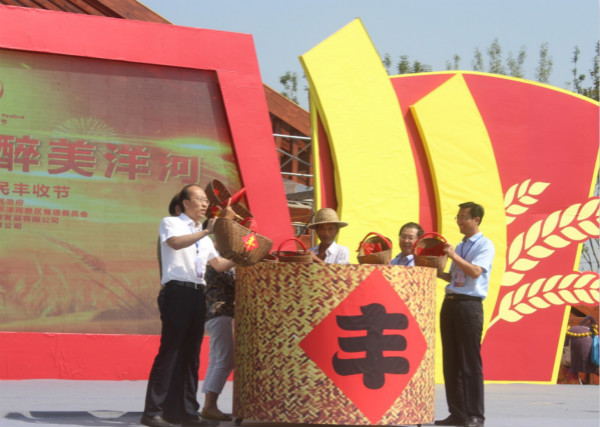 來(lái)自洋河當(dāng)?shù)氐膬晌晦r(nóng)民代表王慶豐和劉紅俠,站在舞臺(tái)中央,和洋河新區(qū)黨委書(shū)記張聯(lián)東、中國(guó)農(nóng)業(yè)大學(xué)農(nóng)業(yè)規(guī)劃科學(xué)研究所所長(zhǎng)張?zhí)熘淌?,以及中?guó)農(nóng)業(yè)大學(xué)國(guó)際學(xué)院原院長(zhǎng)孟繁錫等專家、領(lǐng)導(dǎo)、嘉賓一道,共同將篩里的糧食倒?jié)M糧倉(cāng),現(xiàn)場(chǎng)的觀眾發(fā)出“豐收大吉”的歡呼聲響徹全場(chǎng)。