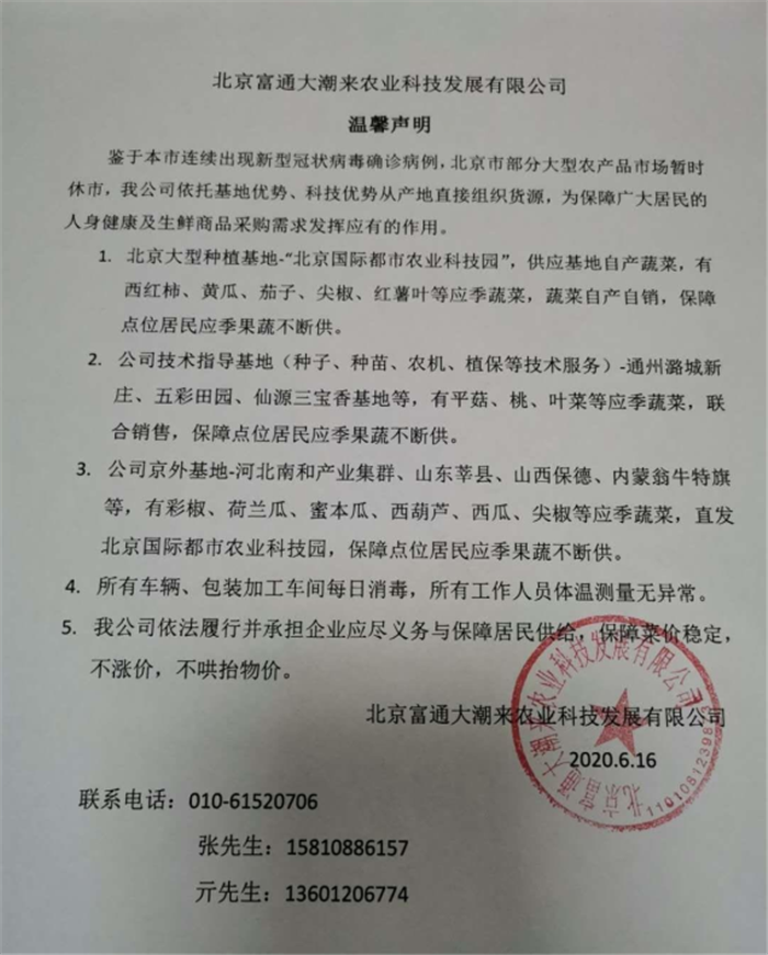 ▼在北京農(nóng)產(chǎn)品市突發(fā)疫情后,北京富通大潮來農(nóng)業(yè)科技發(fā)展有限公司(簡(jiǎn)稱 富通大潮來)依托基地優(yōu)勢(shì)、科技優(yōu)勢(shì)從產(chǎn)地直接組織貨源,為保障廣大居民的人身健康及生鮮商品采購需求發(fā)揮應(yīng)有的作用。應(yīng)對(duì)非常時(shí)期民生需求,全力以赴穩(wěn)價(jià)格、保供應(yīng)。富通大潮來從基地點(diǎn)對(duì)點(diǎn)對(duì)接 70 余個(gè)社區(qū),疫情期間,減少污染接觸環(huán)節(jié),保證市民菜價(jià)。