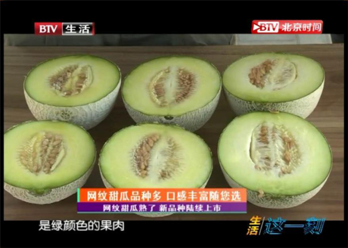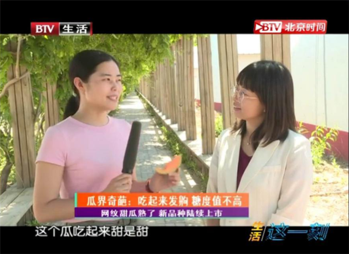 ▼5月25日,BTV北京時間《生活這一刻》直播生活資訊欄目對富通大潮來的“網(wǎng)紋甜瓜”進行專題報道。其中北京農(nóng)業(yè)技術推廣站高級農(nóng)藝師李婷講解了新品種陸續(xù)上市情況,網(wǎng)紋甜瓜如何種植,糖度多高等知識。介紹說全市一共有 75 個品種的網(wǎng)紋甜瓜,富通大潮來科技園供應基地有 19 個品種的網(wǎng)紋甜瓜,這里品種豐富,可以讓你會品嘗到不同口味。