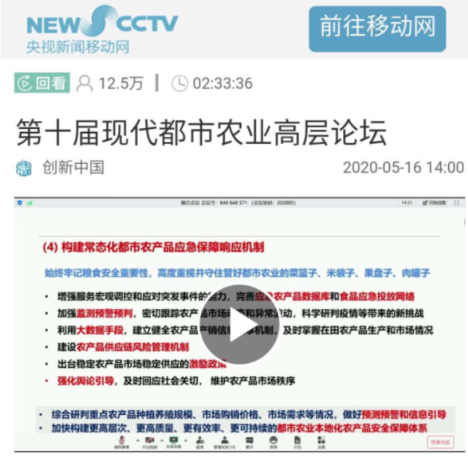 ▼5月16日下午,由中國農(nóng)業(yè)大學(xué)農(nóng)業(yè)規(guī)劃科學(xué)研究所主辦,北京中農(nóng)富通園藝有限公司承辦的第十屆現(xiàn)代都市農(nóng)業(yè)高層論壇取得圓滿成功。此次高層論壇首次采取線上直播的方式。據(jù)16日17點(diǎn)數(shù)據(jù),共13萬余人次在線觀看了本次論壇。