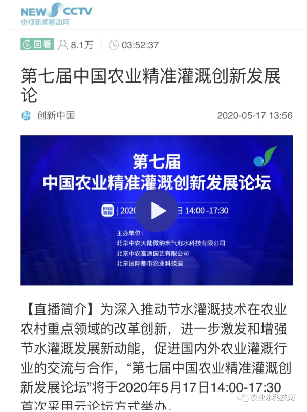 ▼2020年5月17日下午,第十屆北京(通州)國際都市農(nóng)業(yè)科技節(jié)同期舉辦了“第七屆中國農(nóng)業(yè)精準(zhǔn)灌溉創(chuàng)新發(fā)展論壇”線上論壇,本次論壇由北京中農(nóng)天陸微納米氣泡水科技有限公司、北京中農(nóng)富通園藝有限公司、北京國際都市農(nóng)業(yè)科技園共同主辦,論壇邀請了農(nóng)業(yè)農(nóng)村部全國農(nóng)業(yè)技術(shù)推廣服務(wù)中心高祥照研究員、中國農(nóng)業(yè)大學(xué)水利與土木工程學(xué)院李光永教授、中國農(nóng)業(yè)科學(xué)院農(nóng)田灌溉研究所馮俊杰研究員、北京中農(nóng)天陸微納米氣泡水科技有限公司項(xiàng)目管理事業(yè)部經(jīng)理許慶廣、以色列耐特菲姆公司中國區(qū)技術(shù)總監(jiān)謝永華、張家口三生智慧農(nóng)業(yè)科技有限公司副總經(jīng)理王衛(wèi)忠、科迪馬集團(tuán)中國區(qū)銷售經(jīng)理李大征等嘉賓進(jìn)行了精彩的交流分享,取得圓滿成功。