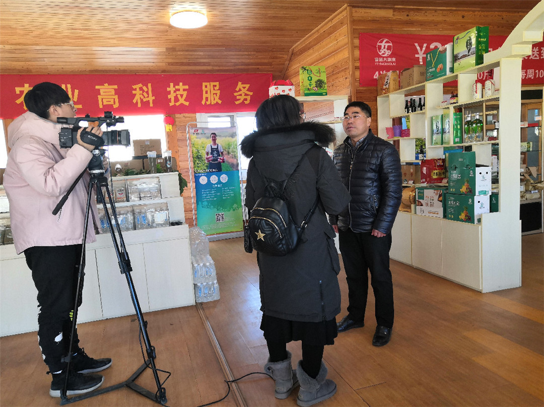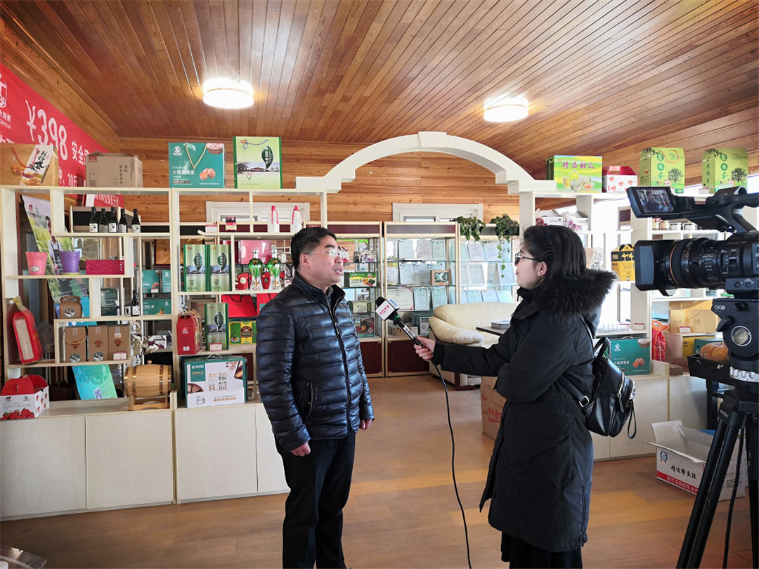 ▼近日,年關將近,為讓北京市民能過一個快樂祥和的春節(jié),北京富通大潮來農(nóng)業(yè)科技有限公司準備了琳瑯滿目的年貨。圖為北京富通大潮來總經(jīng)理亓德明接受通州電視臺采訪。