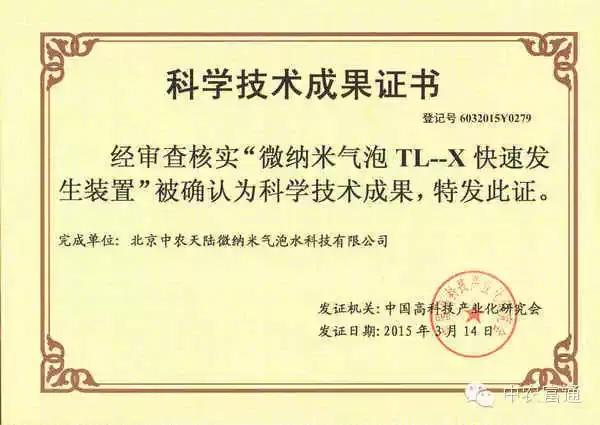 使用微納米氣泡快速發(fā)生裝置,通過觸摸屏上的開啟即可快速制取微納米氣泡。以微納米氣泡技術(shù)為核心技術(shù),自主研發(fā)設(shè)備10余款,目前共申請(qǐng)獲得30項(xiàng)知識(shí)產(chǎn)權(quán),其中發(fā)明專利5項(xiàng)。北京中農(nóng)天陸微納米氣泡水科技有限公司在2013年北京市專利試點(diǎn)工作中驗(yàn)收合格。該產(chǎn)品獲得的榮譽(yù)有2015年國家科技成果,2016年入選了北京市新技術(shù)新產(chǎn)品,2016年最佳技術(shù)裝備獎(jiǎng),2017年北京市企業(yè)創(chuàng)新大賽三等獎(jiǎng)。以該技術(shù)為重點(diǎn)召開多場(chǎng)研發(fā)專項(xiàng)、推廣會(huì)等。