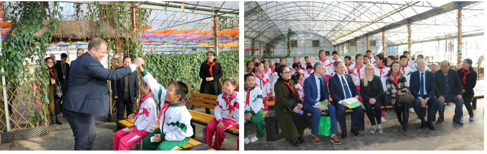 參觀過程中,在草莓溫室外賓對園區(qū)草莓新品種培育產(chǎn)生了濃厚的興趣,詢問草莓的種植技術(shù)、種植環(huán)境及產(chǎn)量,科技園副總工李玉江進(jìn)行了詳細(xì)的講解;在花卉景觀溫室對百香果花發(fā)出了驚嘆,“太漂亮了,從來沒有見過這種植物”;在果樹區(qū)對科技園全程機(jī)械化種植管理應(yīng)用表示了贊賞;在科技園田間超市詳細(xì)了解了果樹枝粉碎種蘑菇、高密度養(yǎng)魚及微納米氣泡技術(shù),表示可借鑒學(xué)習(xí);當(dāng)走向科技園科普大講堂區(qū)域,國際外賓受到了在科技園進(jìn)行“我與小樹共成長”公開課的通州運(yùn)河小學(xué)師生的熱情邀請,互相擊掌表示友好,并集體拍照留念;