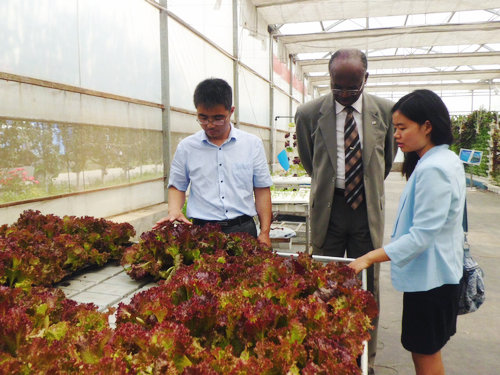 科技園場(chǎng)長(zhǎng)傅常智熱情接待了大使。在介紹園區(qū)規(guī)劃總體情況之后,傅場(chǎng)長(zhǎng)帶領(lǐng)大使參觀了展示新品種、新技術(shù)的溫室,詳細(xì)介紹了水培、潮汐式灌溉等現(xiàn)代栽培模式,并表示通過農(nóng)業(yè)物聯(lián)網(wǎng)和各種大田機(jī)械的運(yùn)用,園區(qū)已經(jīng)基本實(shí)現(xiàn)了信息化與機(jī)械化。經(jīng)過在園區(qū)展示區(qū)域的參觀,大使更深刻理解了北京國(guó)際都市農(nóng)業(yè)科技園高效生產(chǎn)和科研推廣展示的功能定位。
