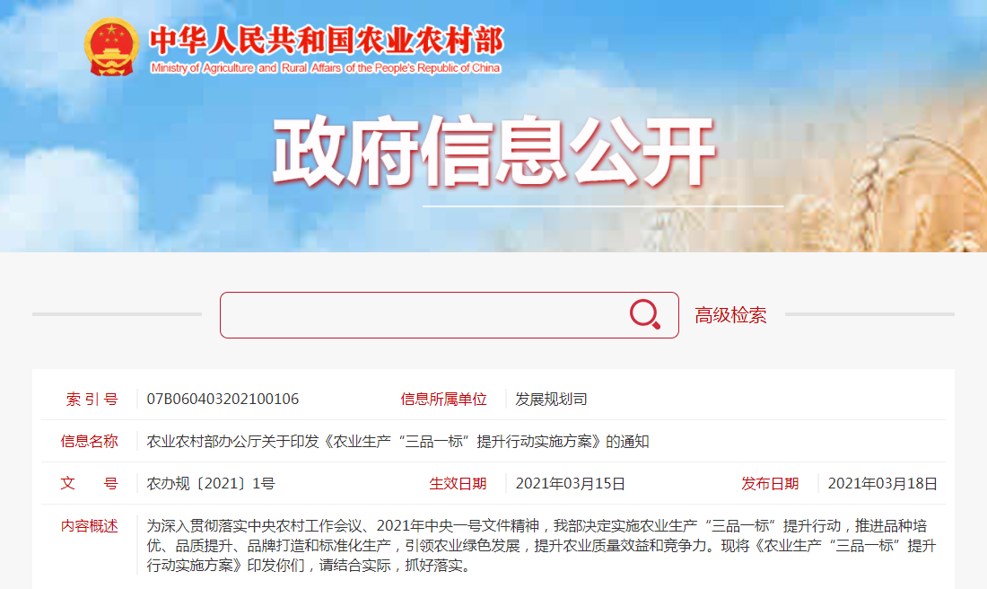 為貫徹落實中央農(nóng)村工作會議和中央一號文件精神,從2021年開始,啟動實施農(nóng)業(yè)生產(chǎn)“三品一標(biāo)”(品種培優(yōu)、品質(zhì)提升、品牌打造和標(biāo)準(zhǔn)化生產(chǎn))提升行動,更高層次、更深......