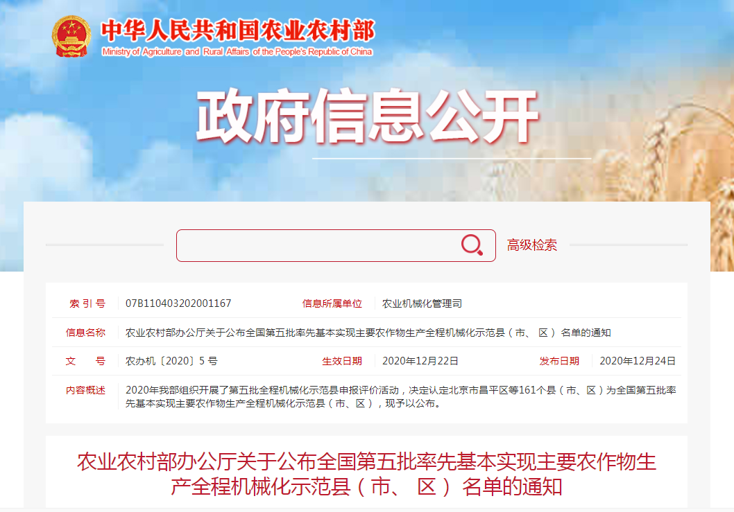 ,2020年我部組織開展了第五批全程機(jī)械化示范縣申報(bào)評(píng)價(jià)活動(dòng)。在各地?fù)駜?yōu)申報(bào)、省級(jí)初評(píng)推薦的基礎(chǔ)上,經(jīng)組織現(xiàn)場(chǎng)抽查、專家審核復(fù)評(píng)和網(wǎng)上公示,決定認(rèn)定北京市昌平區(qū)......
