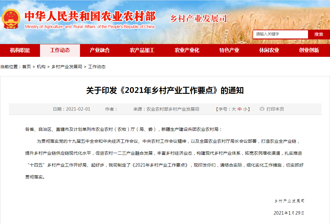 為貫徹落實(shí)黨的十九屆五中全會(huì)和中央經(jīng)濟(jì)工作會(huì)議、中央農(nóng)村工作會(huì)議精神,以及全國(guó)農(nóng)業(yè)農(nóng)村廳局長(zhǎng)會(huì)議部署,打造農(nóng)業(yè)全產(chǎn)業(yè)鏈,提升鄉(xiāng)村產(chǎn)業(yè)鏈供應(yīng)鏈現(xiàn)代化水平,促進(jìn)農(nóng)村......