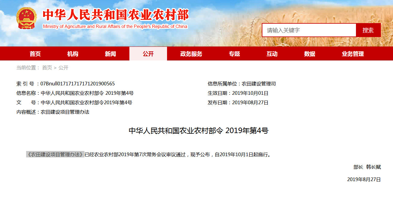 《農(nóng)田建設(shè)項(xiàng)目管理辦法》已經(jīng)農(nóng)業(yè)農(nóng)村部2019年第7次常務(wù)會議審議通過,現(xiàn)予公布,自2019年10月1日起施行。 ...